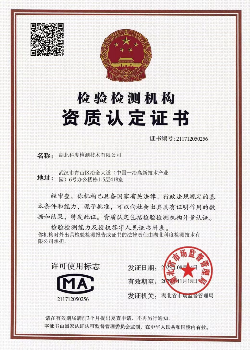 湖北科度檢測技術有限公司是一家專業(yè)從事環(huán)境類及相關領域檢測的第三方檢測機構,公司已通過湖北省市場監(jiān)督管理局CMA計量認證,可以面向社會出具權威CMA檢測報告。 我公司實驗室嚴格按照國家標準建設,擁有一大批國內(nèi)外先進儀器設備及現(xiàn)代化配套設施,并有經(jīng)驗豐富的中高級專業(yè)技術人員和嚴格的實驗室質量保證體系為項目運作提供強力支撐。 作為第三方檢測機構,公司始終以高度的社會責任感經(jīng)營企業(yè),以“公正、嚴謹、高效”為宗旨,依托專業(yè)的技術實力為客戶提供專業(yè)優(yōu)質檢測服務,受到政府、企業(yè)和社會各界的廣泛關注和認可。